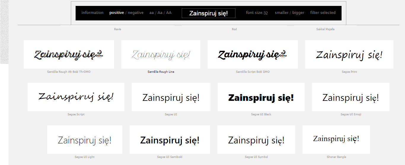 Czwartą propozycją z kolei jest strona woodmark.it, która proponuje nam szybki wybór czcionek. Jedyny minus jest taki, że wszystkie czcionki jakie zobaczymy, to te, które mamy już zainstalowane. Mimo wszystko bardzo ułatwia mi to pracę i daje szybki podgląd na to, czy dana czcionka ma na przykład polskie znaki.